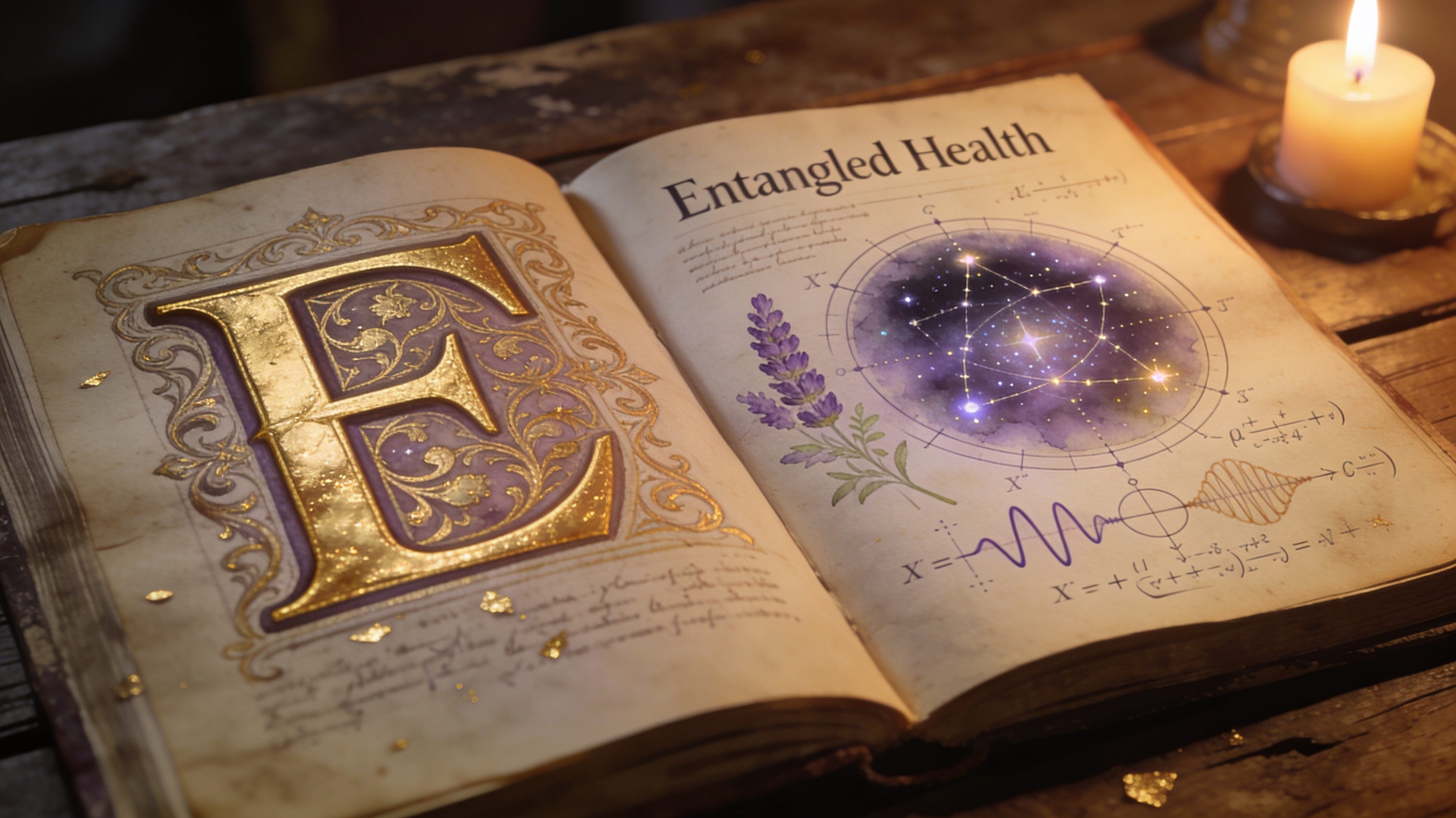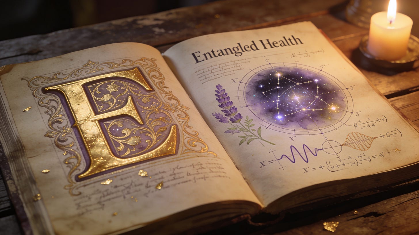 The image prompt: generate a cinematic rendering of a medieval bible style picture, open book on a wooden table, 16:9 format. The drawing reflects holistic medicine and modern healting technology - combining herbal lore, astronomy, mathematics. the font is with a golden capital letter. it is serving as illustration for the entangled health newsletter. make five options - I chose the first option.
